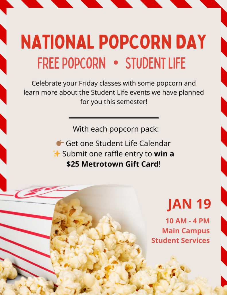 Learn about Student Life at Columbia College! Meet us at our 🍿 Popcorn Stand opposite Student Services to grab some popcorn and snag a Student Life Calendar to learn about the events we have prepped for you this semester!