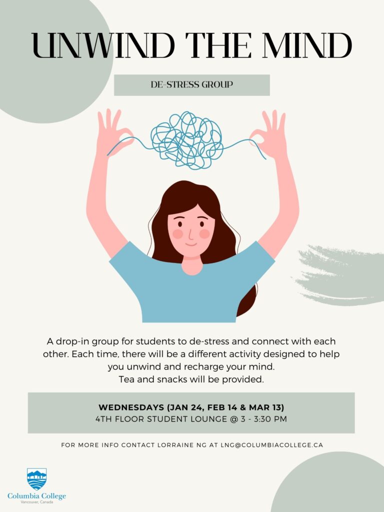 Come join us to UNWIND THE MIND! Unwind the mind is a bi-weekly drop-in group for students to de-stress and connect with each other. Each time, we will be having a different activity to help you unwind and recharge your mind so you can feel more relaxed and energized. It is a great way to take care of yourself and meet new friends. Tea and snacks will also be provided.