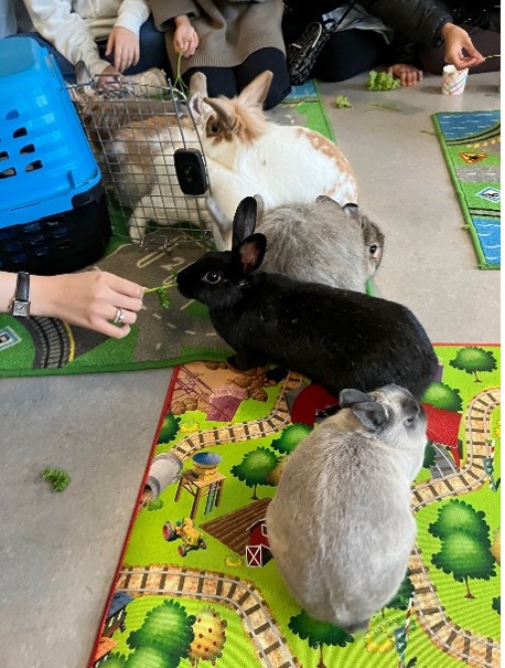 Greet and Treat happens at least once a year. This event is organized in collaboration with Rabbitats, a non-profit organization that fosters and rehomes bunnies. Bunnies are social and gentle creatures, and students enjoy interacting with them and giving them treats.